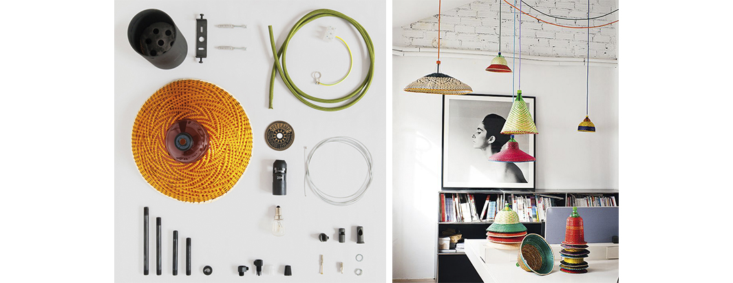 Nos han gustado especialmente las lámparas solidarias de Álvaro Catalán de Ocón, tejidas con fibras de palmera sobre botellas de plástico y elaboradas por artesanos indígenas colombianos desplazados por la guerrilla a Bogotá. Todas cuelgan de cables de colores que las vuelven más bonitas todavía.