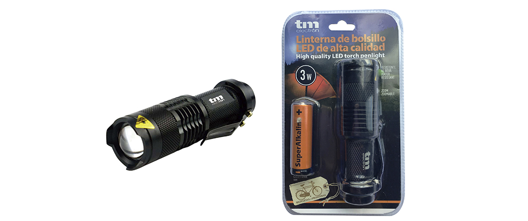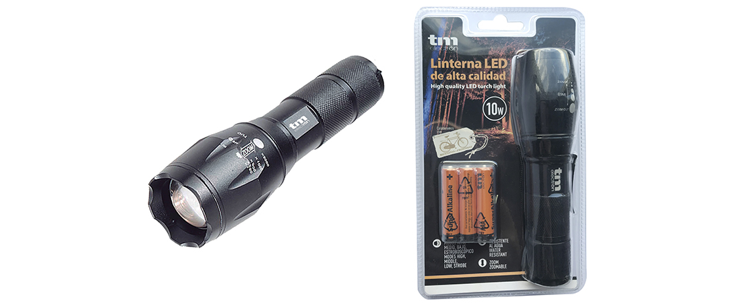 Para aquellos a los que esta linterna se les quede un tanto pequeña, TM Electron ofrece una variable con las mismas calidades pero en mayor tamaño y con el triple de potencia. Su diseño es ideal para los amantes del deporte al aire libre o para llevar en el coche en caso de emergencia. Presenta cinco modos de iluminación: alto, medio, bajo, estroboscópico y SOS. Funciona con 3 pilas AAA, también incluidas en su blíster.