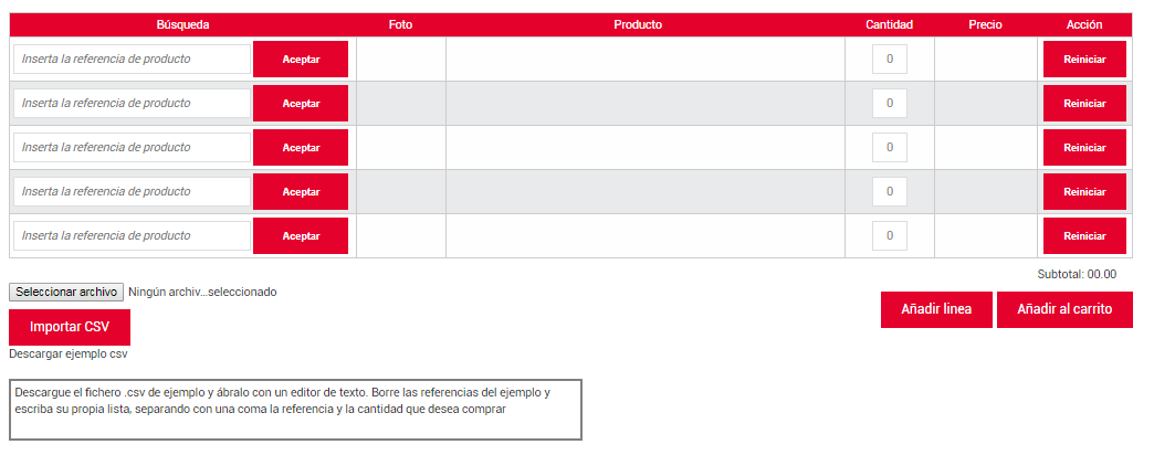 No sólo hemos mejorado la velocidad de navegación, sino que ahora te ofrecemos la posibilidad de hacer tu compra online en muy pocos minutos. En el botón “Compra rápida” podrás cargar referencia y cantidad sin necesidad de pasar por la página de producto. Pruébalo y te encantará.