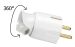 Clavija rotativa 360°, 2P+T con salida de cable recta o lateral. Mixta con toma de tierra lateral y estándar francés. Con abrazadera sujeta cables interna. Se desmonta en dos piezas sin extraer completamente ningún tornillo, evitando la posibilidad de perder elementos.