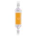 Lámpara lineal LED COB con base R7S de 9W que ofrece 1300 lúmenes de iluminación cálida a 3000K. Ideal para reemplazar lámparas halógenas en espacios interiores, con diseño compacto de 118 mm y alta eficiencia energética.